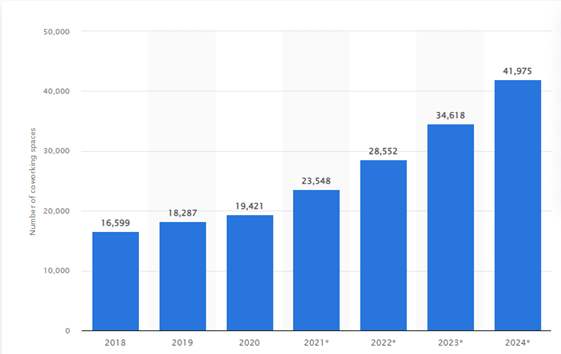 Since 2018, the global number of coworking spaces available has drastically increased from 16,599 to 28,552. A report by Statista has shown that the number is expected to multiply over the years to match the demand, which clearly indicates that coworking spaces are becoming a desired place to work from.